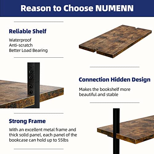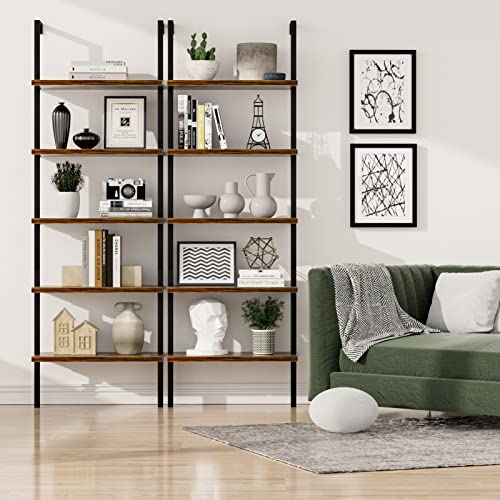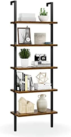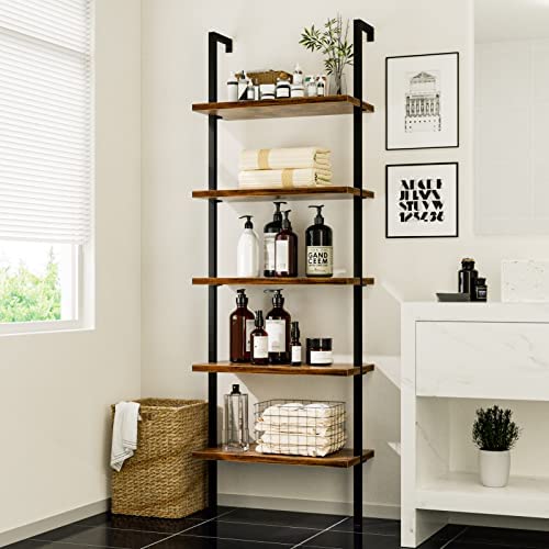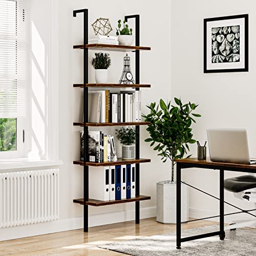 NUMENN 5 Tier Book Shelf, Industrial Ladder Shelf, Open Space Wall Mount Bookshelf with Metal Frame, Sturdy Book Shelves, Bookcase for Living Room, Home Office Shelf, Vintage Brown