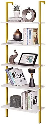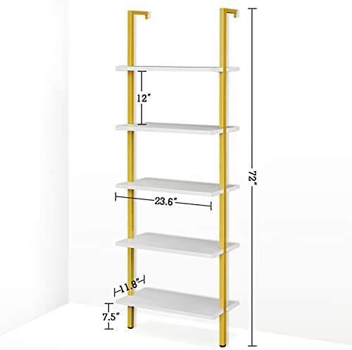 PRAISUN Ladder Shelf, 5 Tier Industrial Bookshelf for Bedroom, Open Wall Mount Bookshelf, Display Storage Rack Organizer, White and Gold Shelves