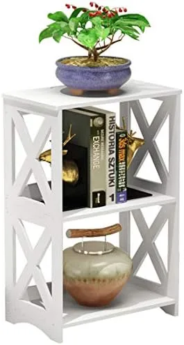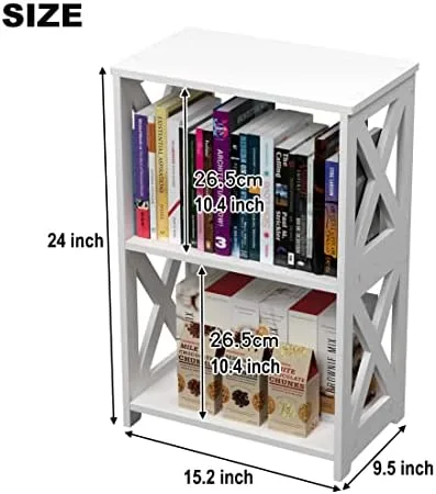 This side table is small size. It is 15 L x 9.5 W x 23.6 H inches. And it is cute with color white as well as the X design on the sides, which goes well with any style of decoration. It is very good to work as small bookcase bookshelf and end table.