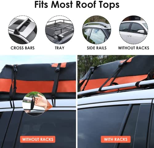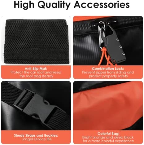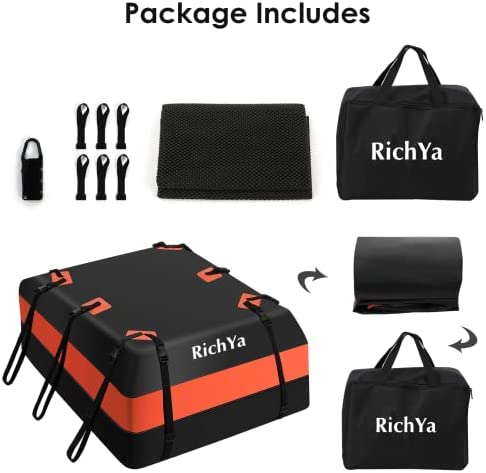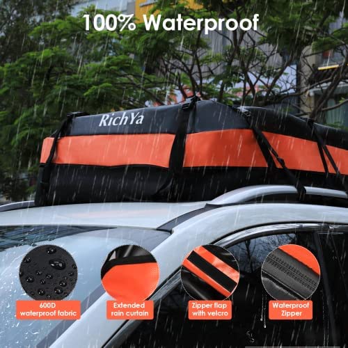 RichYa Car Roof Cargo Carrier, Car Roof Bag for Cars with/Without Rack, 100% Waterproof & Coated Zippers, with Anti-Slip Mat + 10 Reinforced Straps + 6 Door Hooks + 1 Combination Lock – 15 Cubic Feet