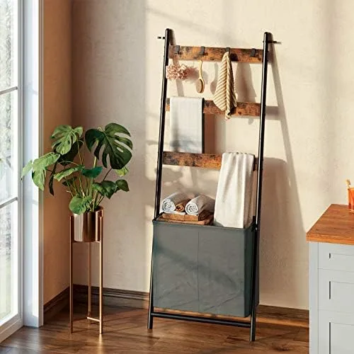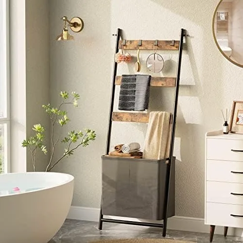 Rolanstar Ladder Shelf with Storage Basket, Blanket Holder Rack with 4 Hanging Hooks, Wall Leaning Ladder Shelf Stand for Bathroom, Living Room, Rustic Brown