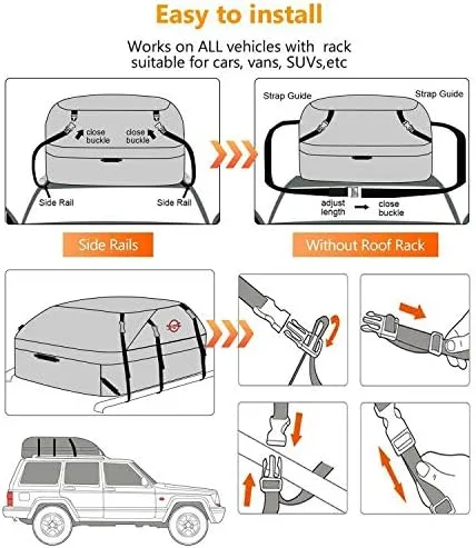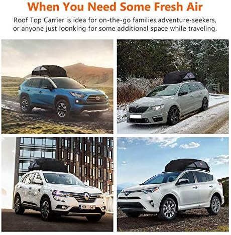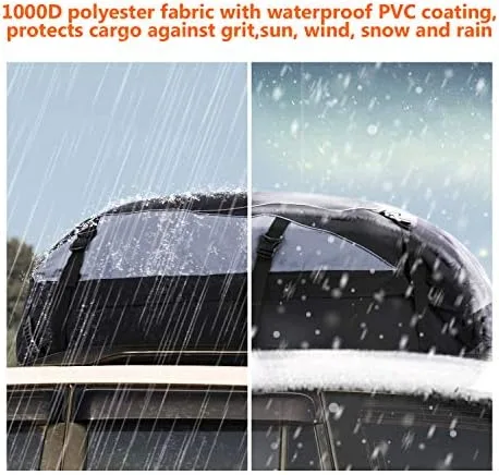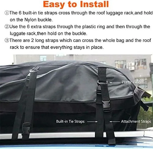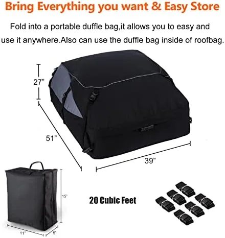 🧳Waterproof Durable Material — The roof cargo carrier is waterproof, offers the best weather protection. Made from rubber laminated nylon,with waterproof PVC material cover the both side zipper of the carrier.Withstands extreme temperatures, wind, sun, rain, snow, or sand.