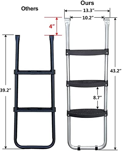 ใ๐๐ข๐๐ & ๐ฆ๐ญ๐๐๐ฅ๐ ๐ฆ๐ญ๐๐ฉ๐ฌใThe widest part of the steps is 2.6 inches, which is wide enough that won’t hurt children’s feet. With slip-resistant design, the trampoline ladder 3 step can prevent slipping when climbing onto the trampoline. Flat & textured 3 extra-wide steps for better stability and safety, are also easy to clean off.