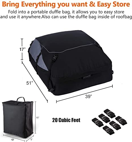 【Large Capacity & Foldable: 】The overall size of the rooftop cargo carrier is 130cm x 100cm x 45cm, Folded size: 38cm x 25cm x 12cm, carry 20 cubic feet of essentials. The soft material makes it foldable and packed in a bag, then you can put it in the car.