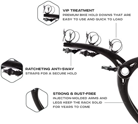 CAPACITY: Carries 3 bikes (35lb/bike), ratcheting anti-sway straps for a secure hold