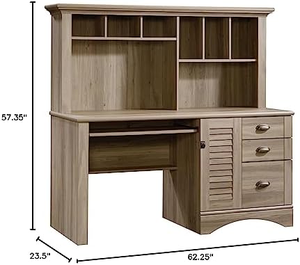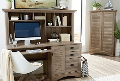 Taking care of business. This computer desk from the Harbor View collection makes getting work done feel like a breeze. It features a slide-out keyboard/mouse shelf, storage and adjustable shelf behind louver detailed door, and three easy gliding drawers. The lower drawer includes full extension slides and holds letter, legal, or European size hanging files. Need more? The hutch includes cubbyhole and vertical storage compartments for all your office essentials. With its Salt Oak finish and all this function, work will feel more like a day at the beach.
