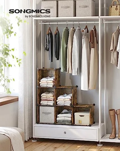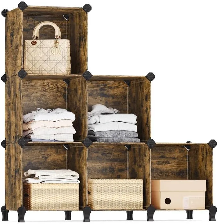 SONGMICS 6 Cube Storage Organizer, DIY Closet Shelf, Plastic Clothes Organizer, Modular Bookcase, 11.8 x 11.8 x 11.8 Inch Cubes, with Feet and Rubber Mallet, Rustic Brown ULPC111A01