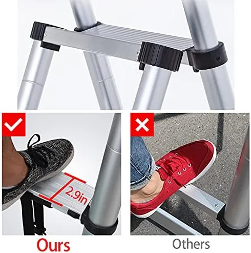 🔥SAFE & RELIABLE: Anti-slip widened pedal design, the large pedal is 2.9 inches wide, small pedal is 1.5 inches wide, Safe and stable, meets non-slip design standards. Non-slip bottom caps and angled feet, benefit to fasten ladders to stairs and floors, which can protect your safety during use and effectively control accidents caused by slippery feet. Meticulous treatment, delicate design and wearable performance.