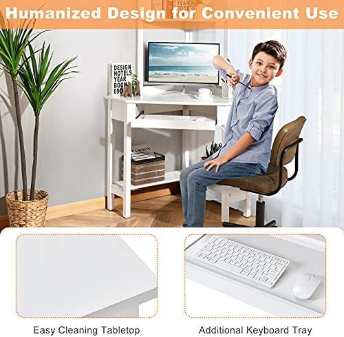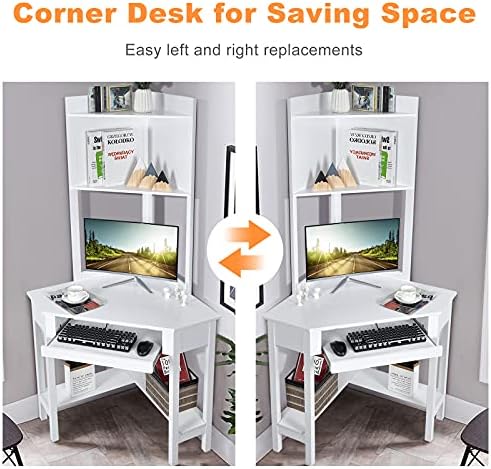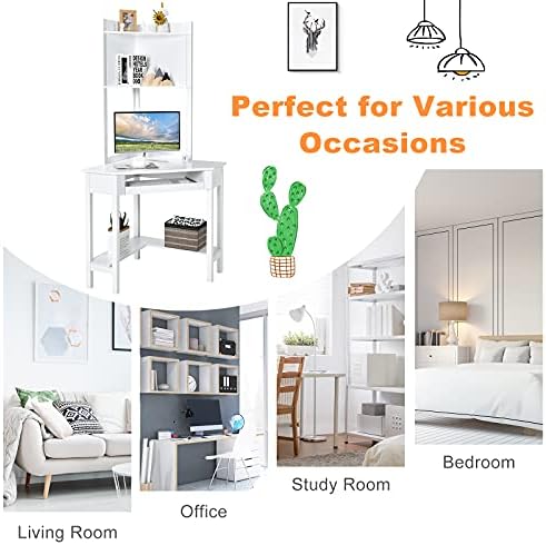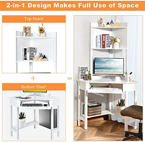Tangkula White Corner Desk with Hutch, 90 Degrees Triangle Corner Computer Desk with Keyboard Tray & Bookshelves for Small Space, Space Saving Writing Desk with Storage Shelves for Bedroom Apartment