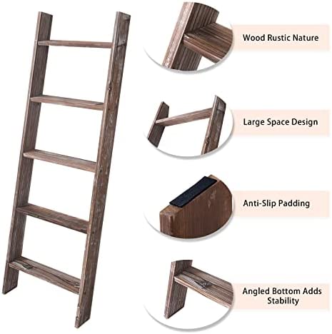 【QUALITY】Ladder shelves made of environmental pine wood (NOT Particle Board) which is solid and has no pungent smell. The ladder is very stable due to the each wood board is combined with two quality hardware fittings. So it could be sustained at least 50lbs weight. Each long side has a leather pad at the bottom to prevent slipping.