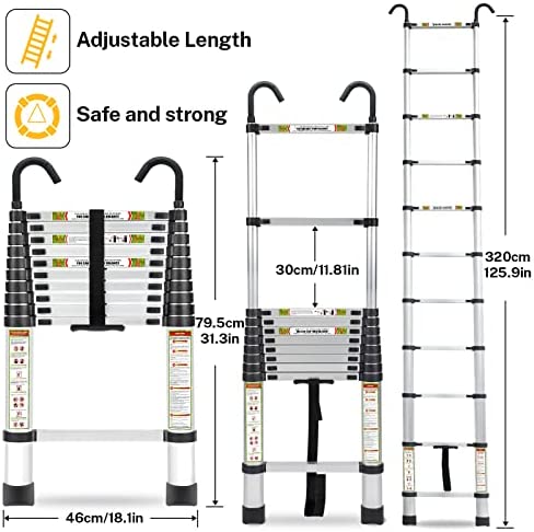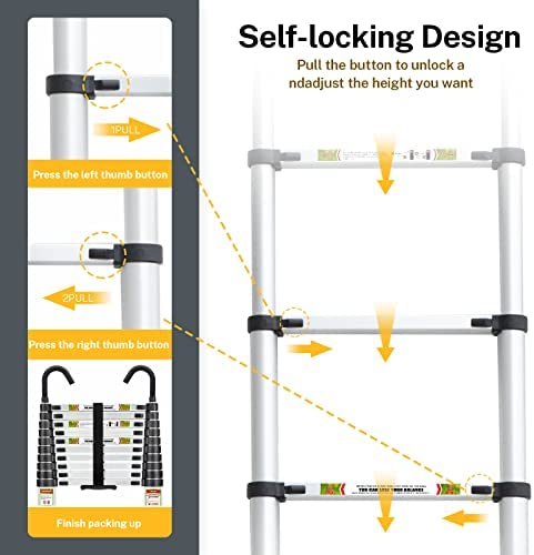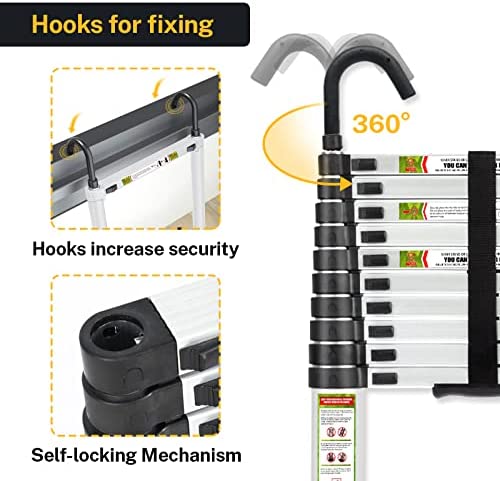 ✔【Double Hooks】:Compare to old version, the top of telescopic ladder add two hooks which makes the using more safe, they will catch the corner like picture shows. When use it indoor, turn the hooks toward you, they still work. And the hooks can be disassemble to save more place.