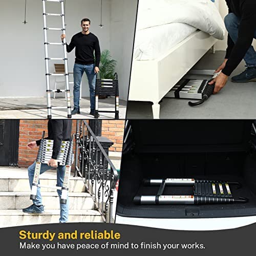 ✔【Portable and Compact】:The lighteweight telescoping ladder and the handrail designed at the bottom make the ladder easy to carry to common scenarios, while the extension ladder can be easily stored under beds, in corners, in storage cabinets and in cars.