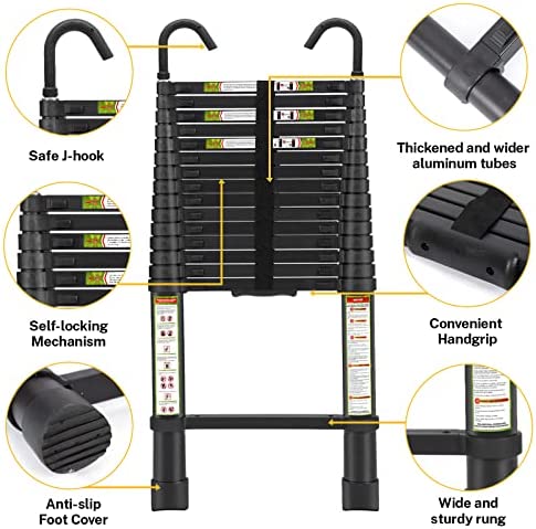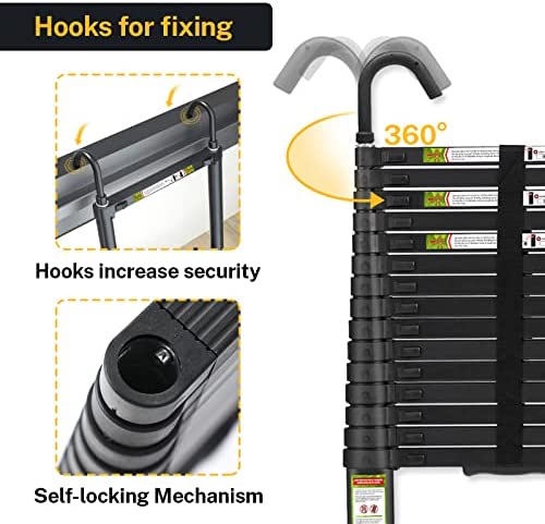 ✔【Double Hooks】:Compare to old version, the top of telescopic ladder add two hooks which makes the using more safe, they will catch the corner like picture shows. When use it indoor, turn the hooks toward you, they still work. And the hooks can be disassemble to save more place.