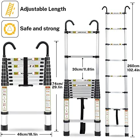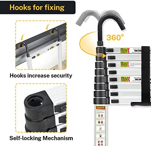 ✔【Double Hooks】:Compare to old version, the top of telescopic ladder add two hooks which makes the using more safe, they will catch the corner like picture shows. When use it indoor, turn the hooks toward you, they still work. And the hooks can be disassemble to save more place.