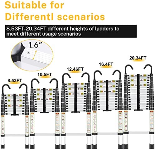 ✔【Portable and Compact】:The lighteweight telescoping ladder and the handrail designed at the bottom make the ladder easy to carry to common scenarios, while the extension ladder can be easily stored under beds, in corners, in storage cabinets and in cars.