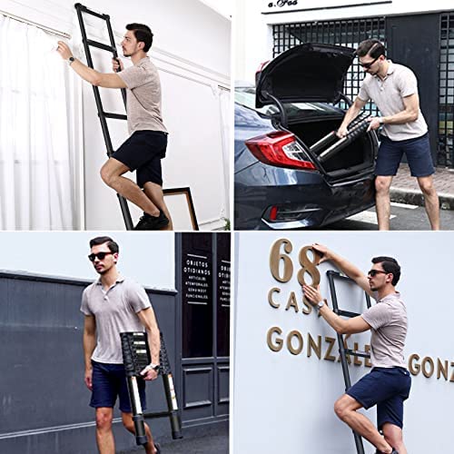 ✔【Portable and Compact】:The lighter weight telescoping ladder and the handrail designed at the bottom make the ladder easy to carry to common scenarios, while the extension ladder can be easily stored under beds, in corners, in storage cabinets and in cars.