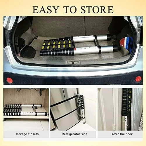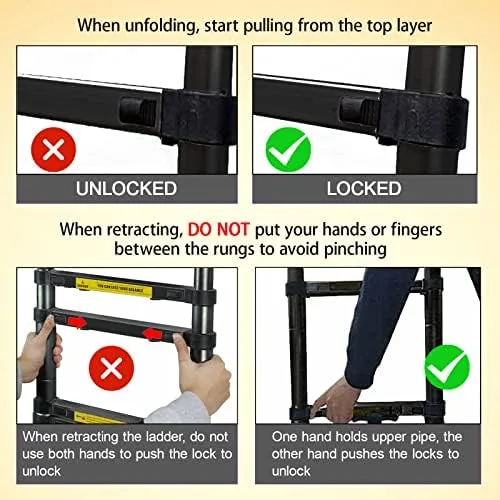 🎉EXTENSION & RETRACTION DESIGN: The telescopic ladder can extend from 77cm (2.5ft) to 3.2m (10.5ft). Unique Extend and Locking Mechanism with Slide Latches, every section is designed to open and close safely. One hand hold upper tube and another hand push the slide latches of both side, then the ladder will slide down effortlessly. No matter what work you do, you can adjust the height of the ladder and lock it according to your needs.
