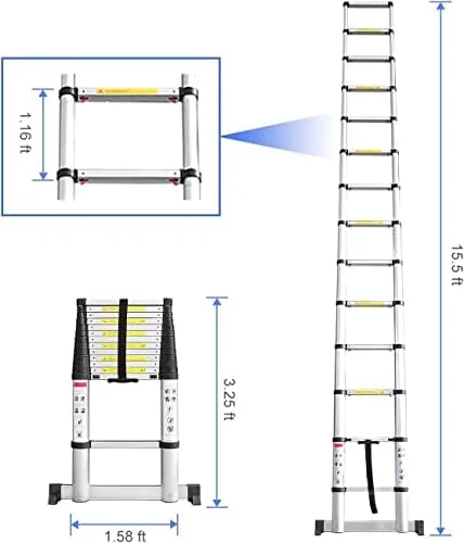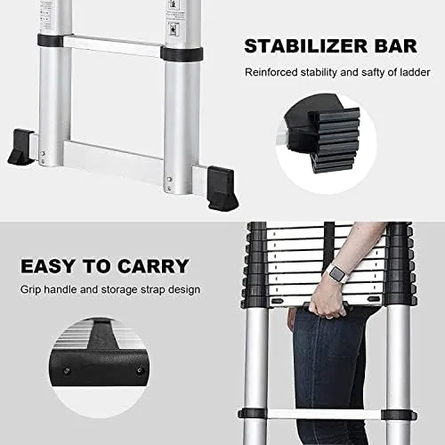 【PORTABLE & SPACE-SAVING】The telescopic ladder can be compressed and made compact for storing it easily in closed spaces, and garages, and carried around with you in the trunk of the car. only 3.25 ft after the telescopic ladder is folded, The net weight is only 28.6 lbs.Carry bag included