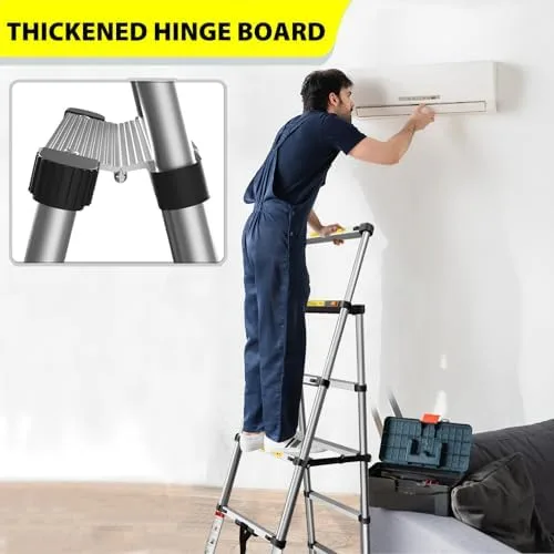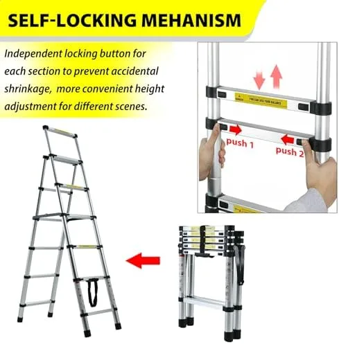 【Warm Reminder】 Please ensure that the telescopic ladder is upright and locked when someone is on the ladder. Telescopic operation: Please start folding from the bottom of the ladder and unfold from the top, and be careful to protect your fingers, do not put them between the steps.