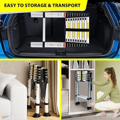 【Portable & Convenient】The telescopic ladder folds to 28in high and weighs 25lb. The folding ladder is easy to place in any corner and comes with locking latches and a heavy duty locking strap to secure it for storage and transport.