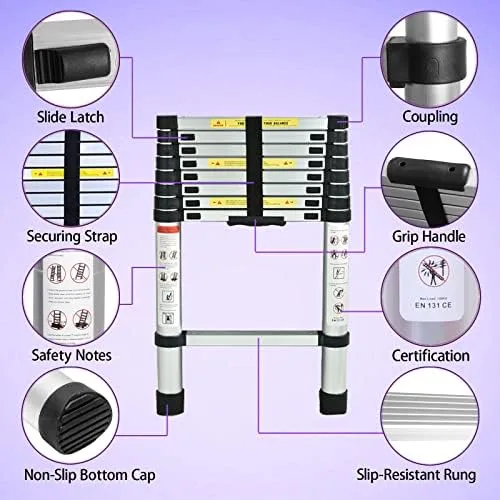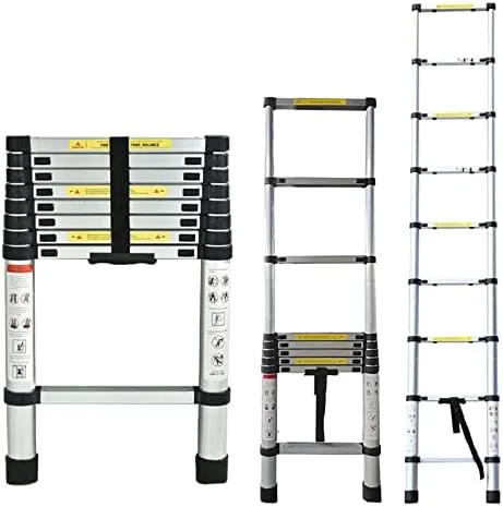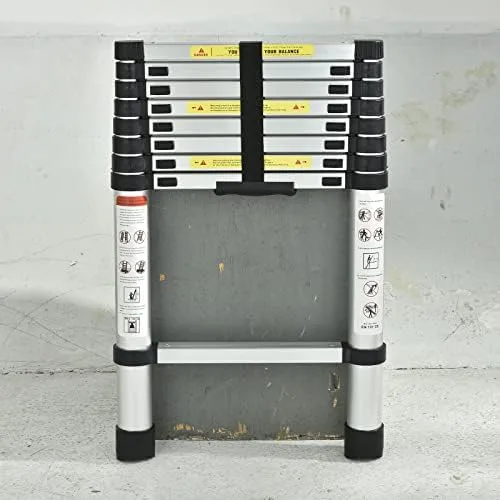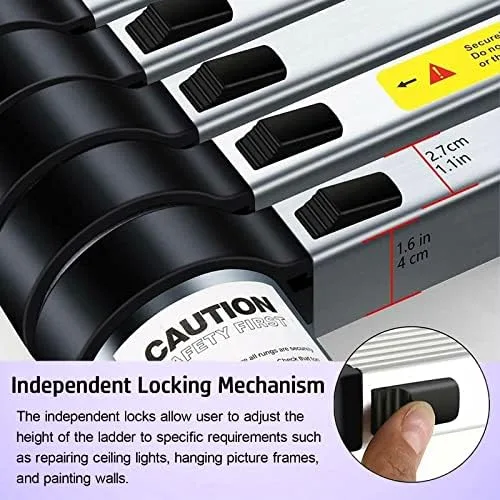 🌟EXTENSION & RETRACTION DESIGN: The telescopic ladder can extend from 72cm (28.3inch) to 2.6m (8.5ft). Unique Extend and Locking Mechanism with Slide Latches, every section is designed to open and close safely. One hand holds upper pipe and the other hand pushes the slide latches of both side, then the ladder will slide down effortlessly. No matter what work you do, you can adjust the height of the ladder and lock it according to your needs.