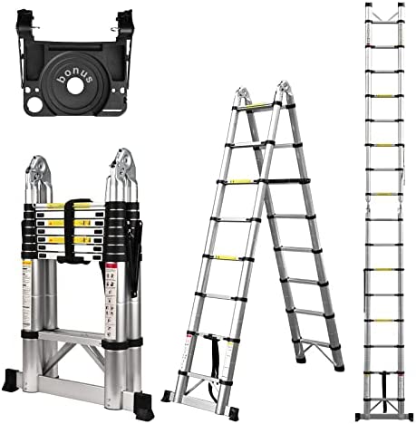 Multi-Purpose A-Frame Ladder, Adjustable from 3ft to 16.5ft. The added two new triangle stabilizers on the upgraded telescopic ladder can reduce the shaking. The Extension ladder can be used as A Frame ladder 8.2ft+8.2ft or 16.5 FT straight ladder for roof,attic stairs.