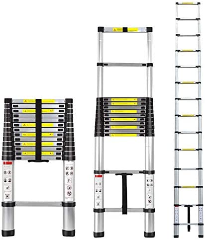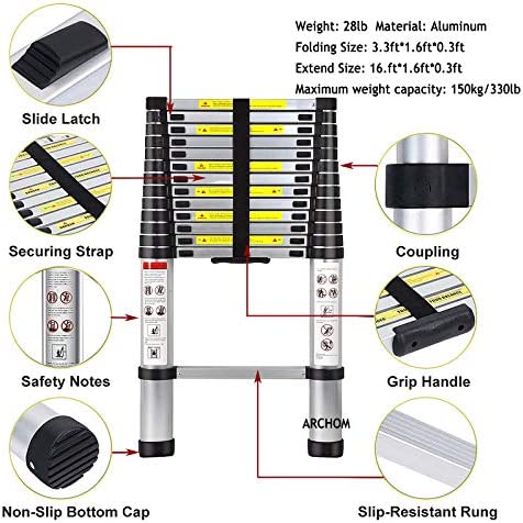 【Lightweight Ladder and Easy to Carry】: The telescoping ladder is very light weight and compact. Weight: 30.9lbs, folding size: 3.3ft*1.6ft*0.3ft, extending size: 16ft*1.6 ft*0.3ft. Telescopic ladder tied with a fixed belt, easily pick up with one hand. Maximum load of 330lbs (150kg)