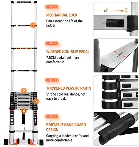 ✪ SPACE SAVING ARBITARY CONTRACTION—The extension ladder can be stored under the sofa or bed, behind the door, in the storage room, or in the trunk of the car.The telescoping ladder can be arbitrarily telescopic length,the fully extended length is18.5 FT and fully retracted height is 3.7 FT.When not in use can be fully folded to save space,convenient and practical.