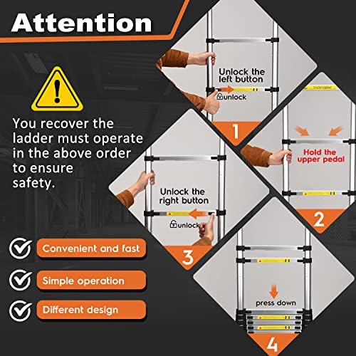 Multi-Scene Application: Changing light bulbs and going up to the attic indoors, or repairing roofs or climbing into RVs outdoors, our aluminum retractable ladders can be used in any scenario where you need a ladder.