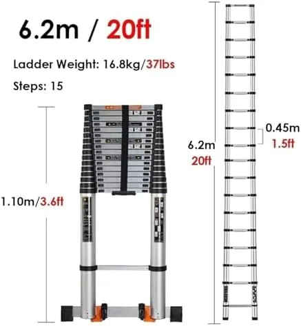 Premium Aluminum Alloy: High-quality Aluminium construction makes this telescopic ladder much safer. Maximum User Weight: 150kg/ 330 lb.