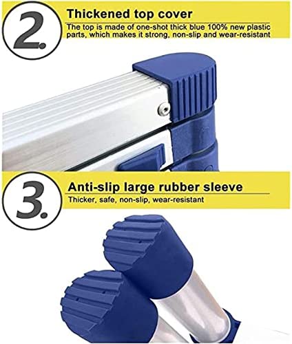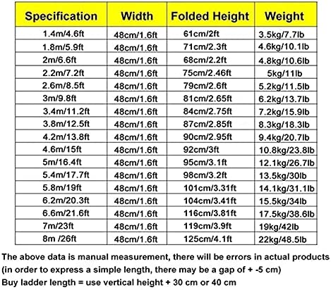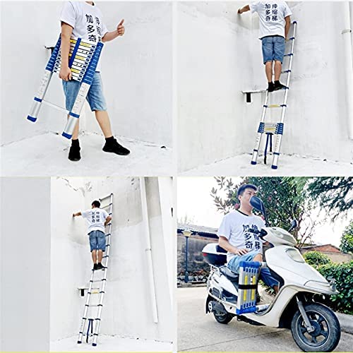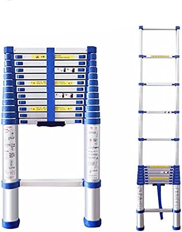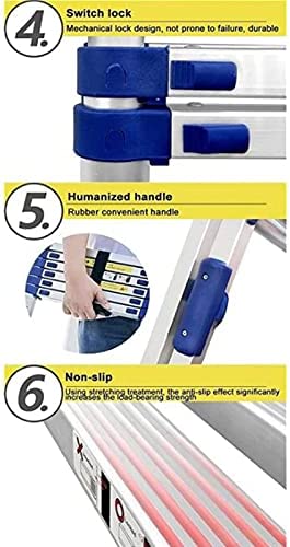Multi Purpose Telescopic Ladder — Extension Steps Ladder, It can be extended to any length you need. Can use for Window Washing Cleaning Job Home Building Maintenance.;Aluminum telescoping Ladder — The Extension Folding Ladders is made of Aluminum, build is sturdy,Lightweight easy to carry for both indoor, outdoor, office, warehouse, bookshop ,Library use.;Security Featureses — Multi Purpose Ladder Designed (EN131 Certified) safety in mind. Double guarantee your safety with anti-slip rubber foot and stable widen rungs.;Extension / retraction — For extension, pull a section up, hear the "click" sound, confirm both left/right locks are in place; for retraction, Press the unlock button, do not put your hand in the Step spacing avoid clip your hand.;Folding Ladder Space-saving — The Telescoping Ladder can Folding Storage in garage, bed bottom, tailbox, a closet or similarly small storage space.