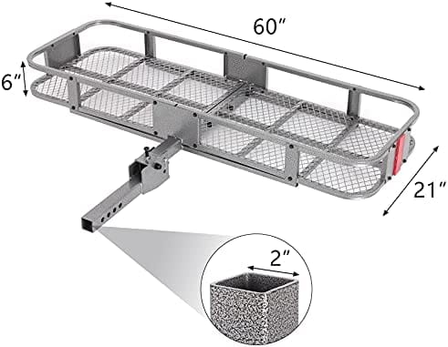 【Enhanced Security】 – Featured 6-inch high walls around the cargo basket and mesh bottom keep your items secure during traveling. Attaching reflectors on the frame promoting a safe ride with this hitch cargo rack. Item Dimension: 60″L x 21″ W x 6″H