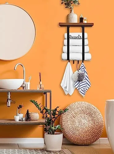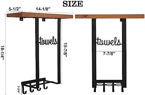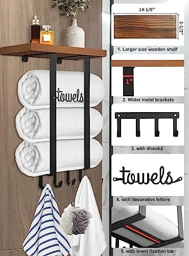 Material: Towel rack using wider and sturdy metal Holder, not easy to bend and break. Wooden shelf of towel storage using pine wood, surface painted, sturdy and durable
