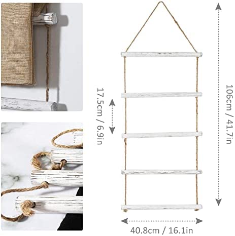 DOCMON Rope ladders make a great alternative to traditional towel rails, this design is made up of naturally bleached timber rungs , strung with natural hessian rope . It is not only stunning to look at, but also very eco-friendly since you are re-purposing old wood into brilliant designs. Having an organic look in your home with nature-inspired objects of Rope Ladders is a very trendy style. This look can create a super rustic ambiance. Ideal for bathrooms where it can hang on the back of a door or from a single hook on the wall but also great for bedrooms and guest rooms where clothes and scarves can be hung up. With five rungs.