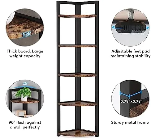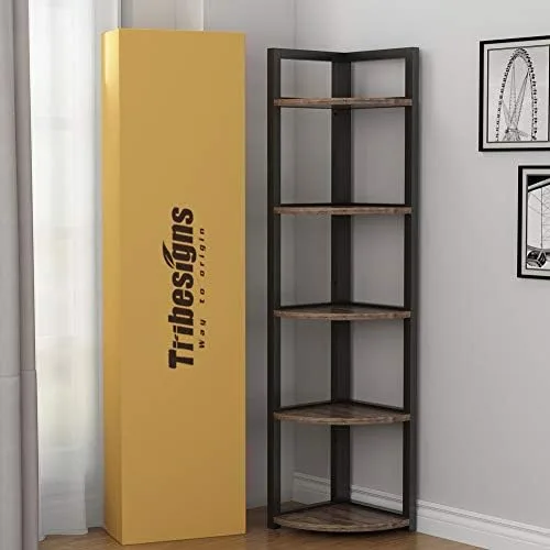 Tribesigns 5 Tier Corner Shelf, Rustic Corner Bookshelf Small Bookcase Storage Rack Plant Stand for Living Room, Home Office, Kitchen, Small Space (Brown)