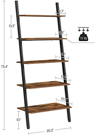 VASAGLE Ladder Shelf, 5-Tier Bookshelf Rack, for Living Room Kitchen Office, Stable Steel, Industrial, Rustic Brown + Black