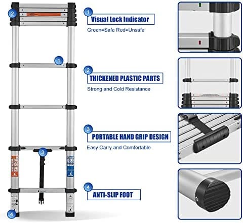 [ One-button Retraction ] The telescopic ladder is designed with one-button retraction function.Only need to gently press the bottom buttons to retract the ladder. The pneumatic soft-close technology protects your fingers from pinching. Green and Red Visual Locking indicators on each rung ensure you to use the ladder safely.