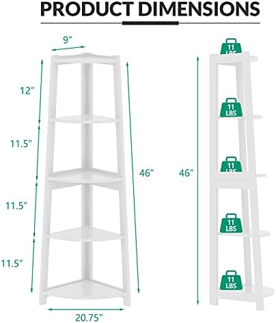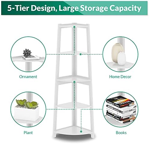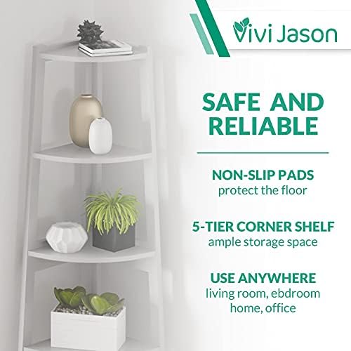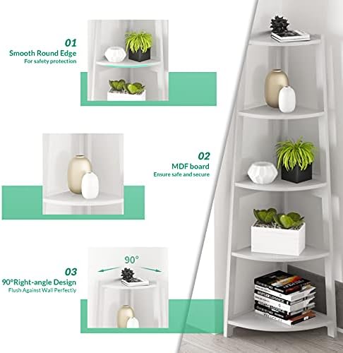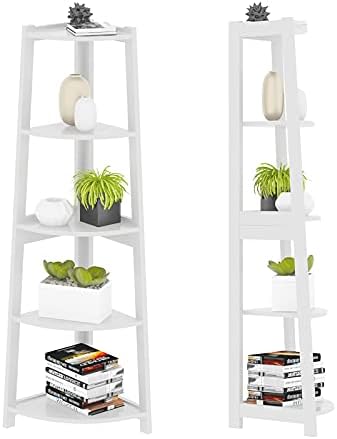 VIVIJASON 5 Tier Corner Shelf – Modern Wall Corner Storage Rack Plant Stand Small Bookshelf – Freestanding Ladder Shelf Display Organizer for Living Room, Kitchen, Home Office, Small Space (White)