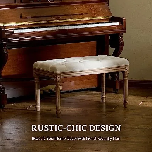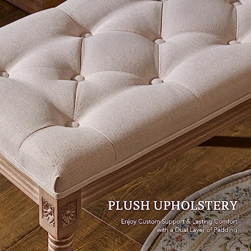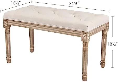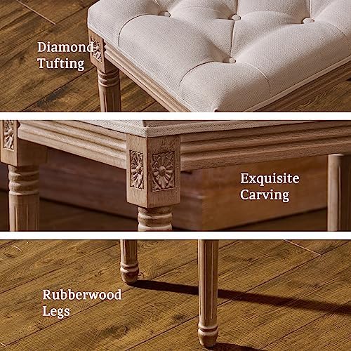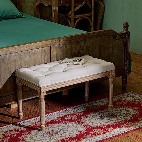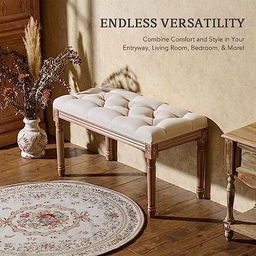 VONLUCE French Vintage Bench with Padded Seat and Rubberwood Legs, Upholstered Entryway Bench Shoe Bench and Dining Bench, Tufted Fabric End of Bed Bench for Bedroom Living Room Hallway More, Beige