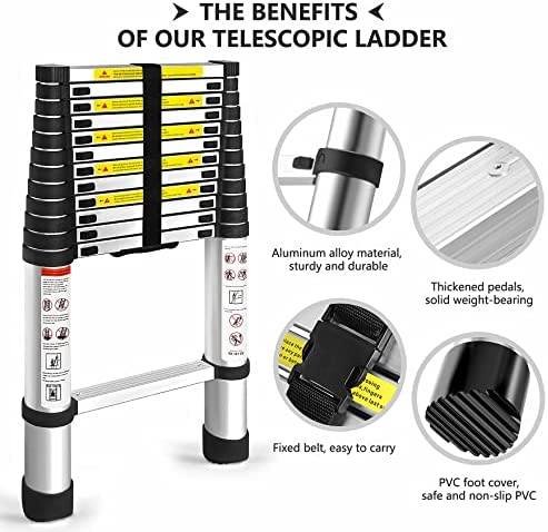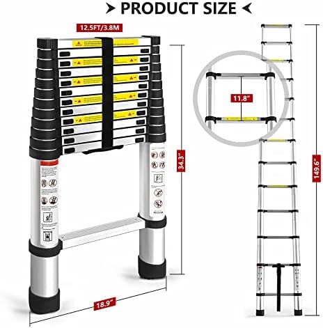 waltyotur 12.5FT / 3.8M Telescoping Ladder, Aluminum extendable Ladder, Folding Ladder, one-Button Retractable Extension Ladder, Portable Ladder for Home and Outdoor Work, Load Capacity 330 pounds