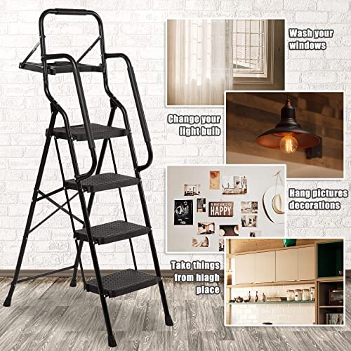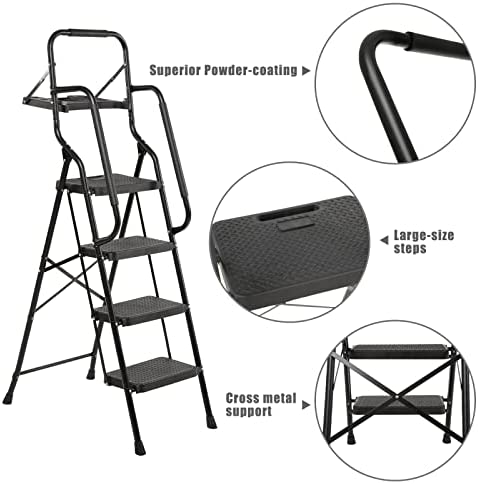 WiberWi 4 Step Ladder with Handrails Folding Step Stool with Tool Plateform, 330 lb Capacity Step Stools for Adults Portable Ladder for Home Kitchen Steel Frame with Non-Slip Wide Pedal