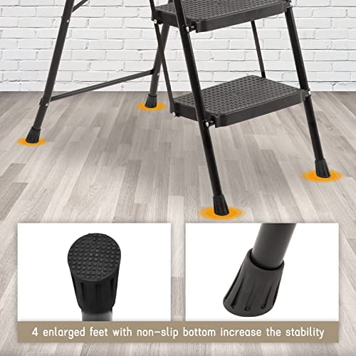 Security and Stability—Upgrade heavy duty steel frame, can withstand 330lbs. Standing platforms measure 14.5″ X 10.5″,wide pedals,sturdy steel frame and enlarged anti-skid rubber feet, as well as metal crossbars provide safety and support while you stand, work, and complete tasks. There is safety buckle under the top step, make sure that it have locked tightly before using the step ladder.