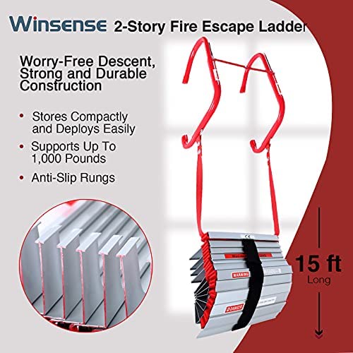 WINSENSE Retractable Fire Escape Ladder 2 Story Homes, 15 Foot with Wide Aluminum Steps for Adults Emergency Window Exit