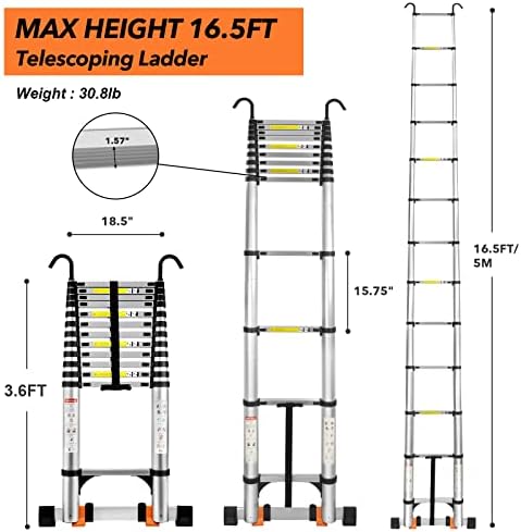 [Adjustable Height & Load-Bearing] The telescoping ladder MAX height is 16.5ft/5M and MIN is 3.6ft(not include hooks),that you can extend to different height you need.Folding ladder weight is 30.8lb,and it have a maximum load of 330lb/150kg.