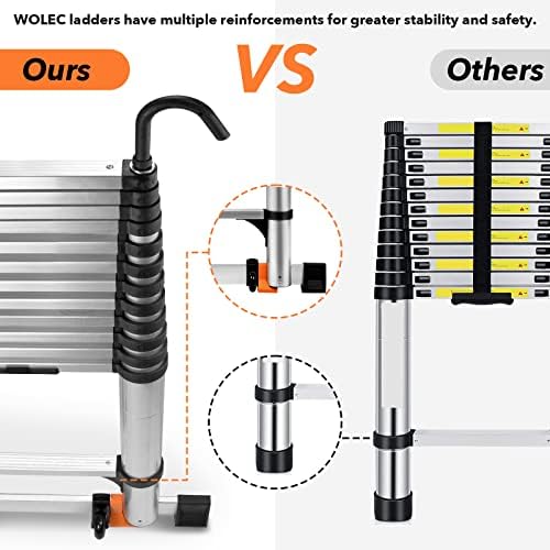 [Anti-pinch Design & Multiple Stability] Wolec values customer safety!Our anti-pinch design minimizes ladder pinching and causing hand injury to users.Ladder foot balance bar and extra orange anti-slip padding blocks are designed to enhance the stability of the ladder.The triangular firmware of the ladder reduces the shaking of the ladder when using.Removable hooks enable the ladder to be better secured in various scenarios where it is needed.