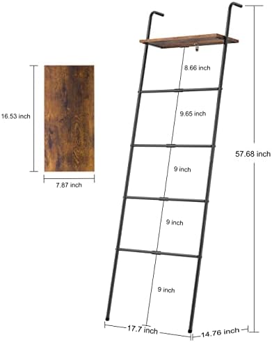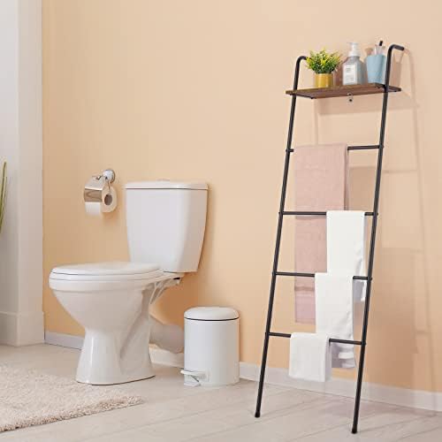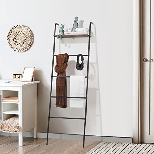 YBING Blanket Ladder 5 Layer Wall-Leaning Ladder Rack with Shelf Decorative Ladder Shelf Metal Leaning Towel Ladder Rack for Blankets or Towels for Living Room Bathroom Rustic Black
