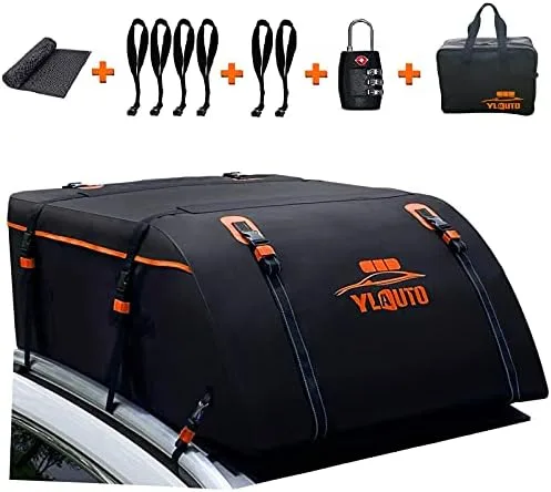【SECURITY+LARGE STORAGE SPACE】ANTI-SLIP MAT+LIGHT REFLECTING STRAPS+HIGH QUALITY STORAGE BAG:The anti-slip mat prevents the rooftop bag from sliding off the car;The reflective straps increases the safety of driving at night;The storage bag with high quality, built-in door hooks storage design, so that accessories orderly storage, easy to carry.The 20 cubic feet YLAUTO roof bag can hold 4-6 suitcases,travel luggage case, tents, sleeping bags and more.