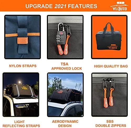 【QUALITY】MILITARY QUALITY+100% WATERPROOF:YLAUTO car roof carrier cargo is made of military grade materials with surface water repellent and built-in PVC coating double waterproof,include heavy-duty SBS waterproof zipper Keep luggage dry in all weather conditions.The TSA lock prevents the zippers from slipping open and make sure your luggage more secure and helps you pass canada customs.